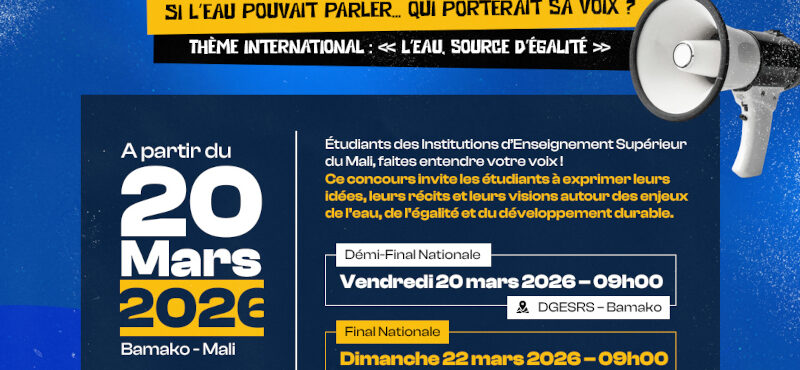 Dans le cadre de la Journée Mondiale de l’Eau 2026, un Concours national inter-Institutions d’Enseignement Supérieur (IES) d’Éloquence et de Storytelling sera organisé à Bamako afin de mobiliser les étudiants autour des enjeux liés à l’eau.
