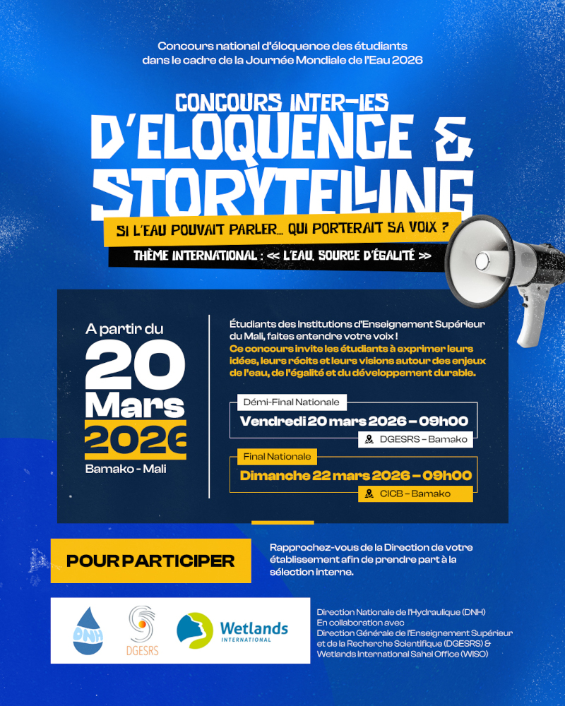 Ce concours est organisé par la Direction Nationale de l’Hydraulique (DNH), en collaboration avec la Direction Générale de l’Enseignement Supérieur et de la Recherche Scientifique (DGESRS) et Wetlands International – Sahel Office (WISO).